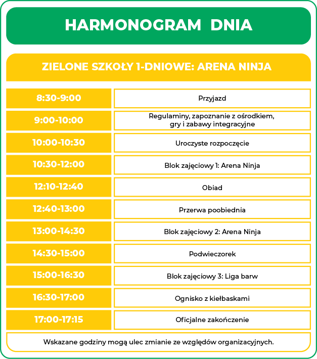 Zielone szkoły 1-dniowe Arena Ninja odbywają się w kwietniu, maju, czerwcu i wrześniu 2026, w poniedziałki, wtorki, czwartki i piątki, w godzinach 8:30-17:15.